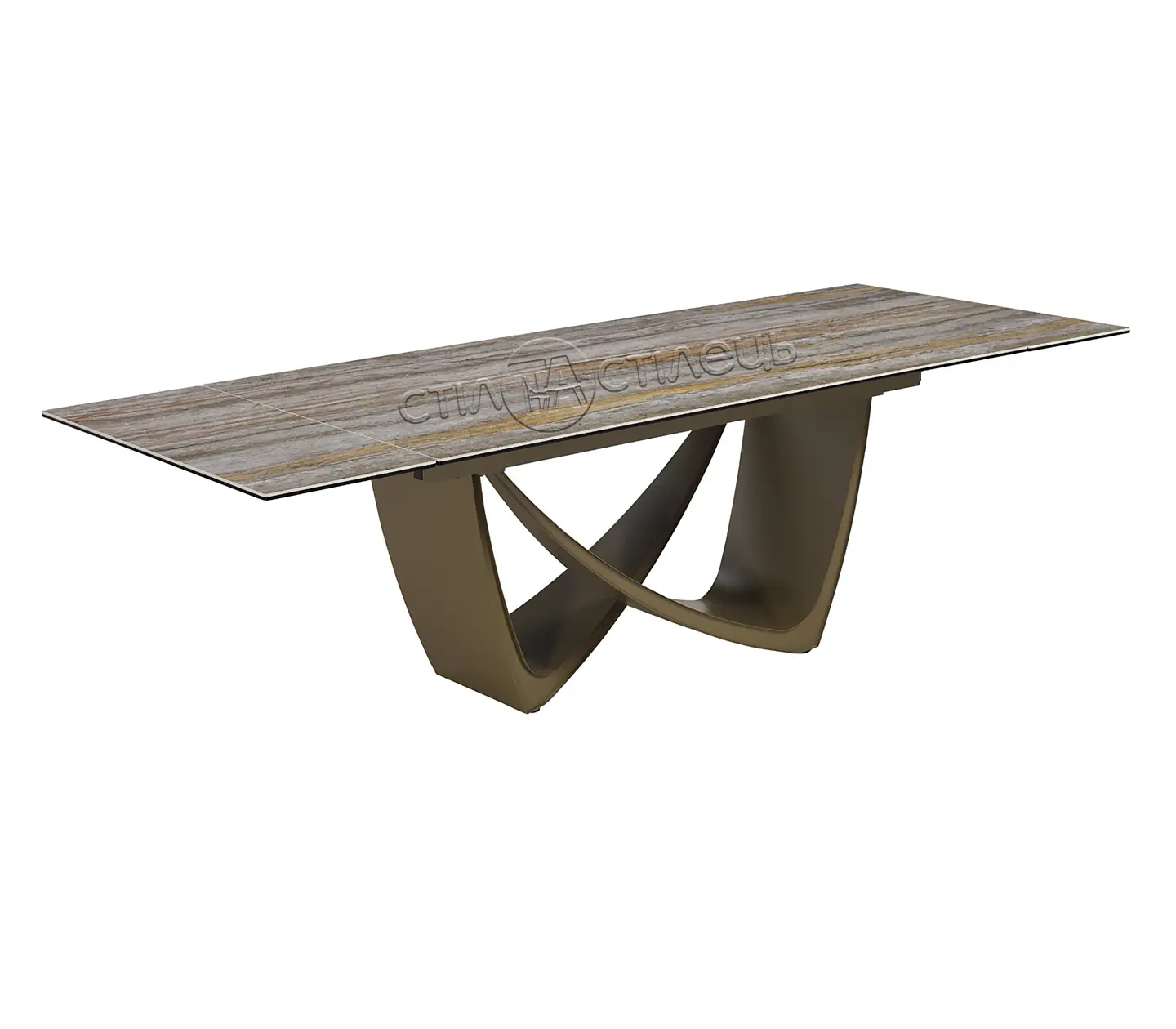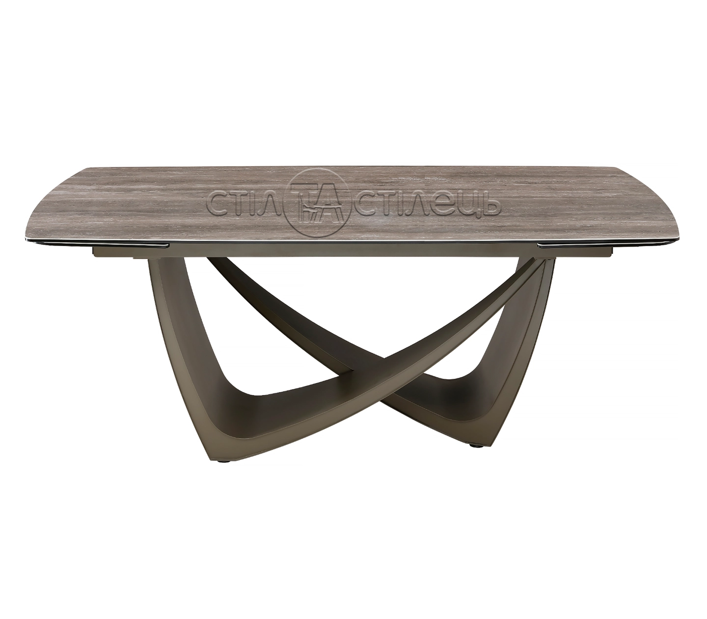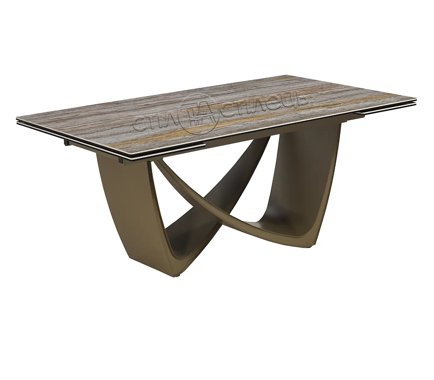 - Керамічний стіл Беатріче у кольорі “тайгер травертін”— стильний стіл із стільницєю, яка поєднує матову кераміку та гартоване скло, що робить її дуже міцною та стійкою до подряпин, тепла, і навіть випадкових пошкоджень. Поверхня столу сповнена природної краси, нагадуючи мармурові текстури. Цей стіл додає інтер’єру розкішного вигляду, а коричнева металева основа додає контрасту, підкреслюючи сучасний стиль. Це поєднання створює враження шику та елегантності.