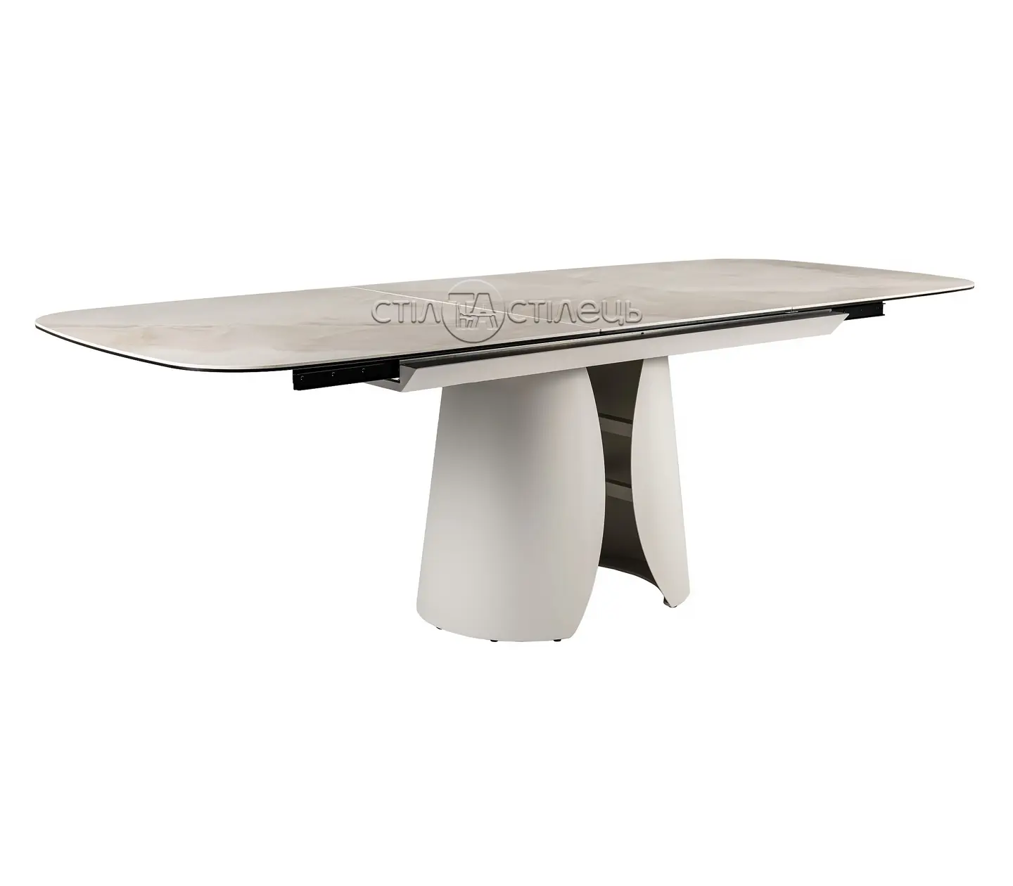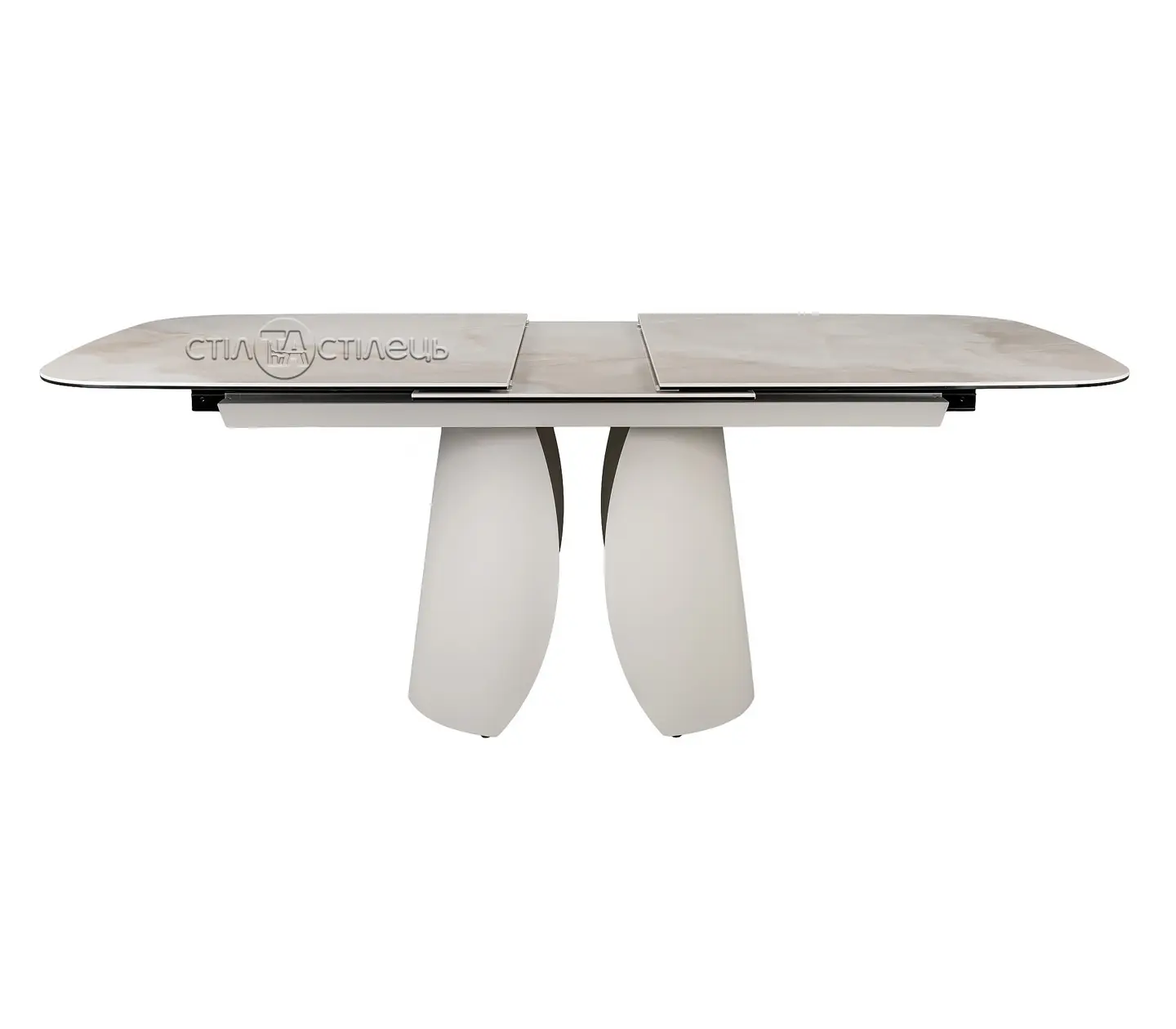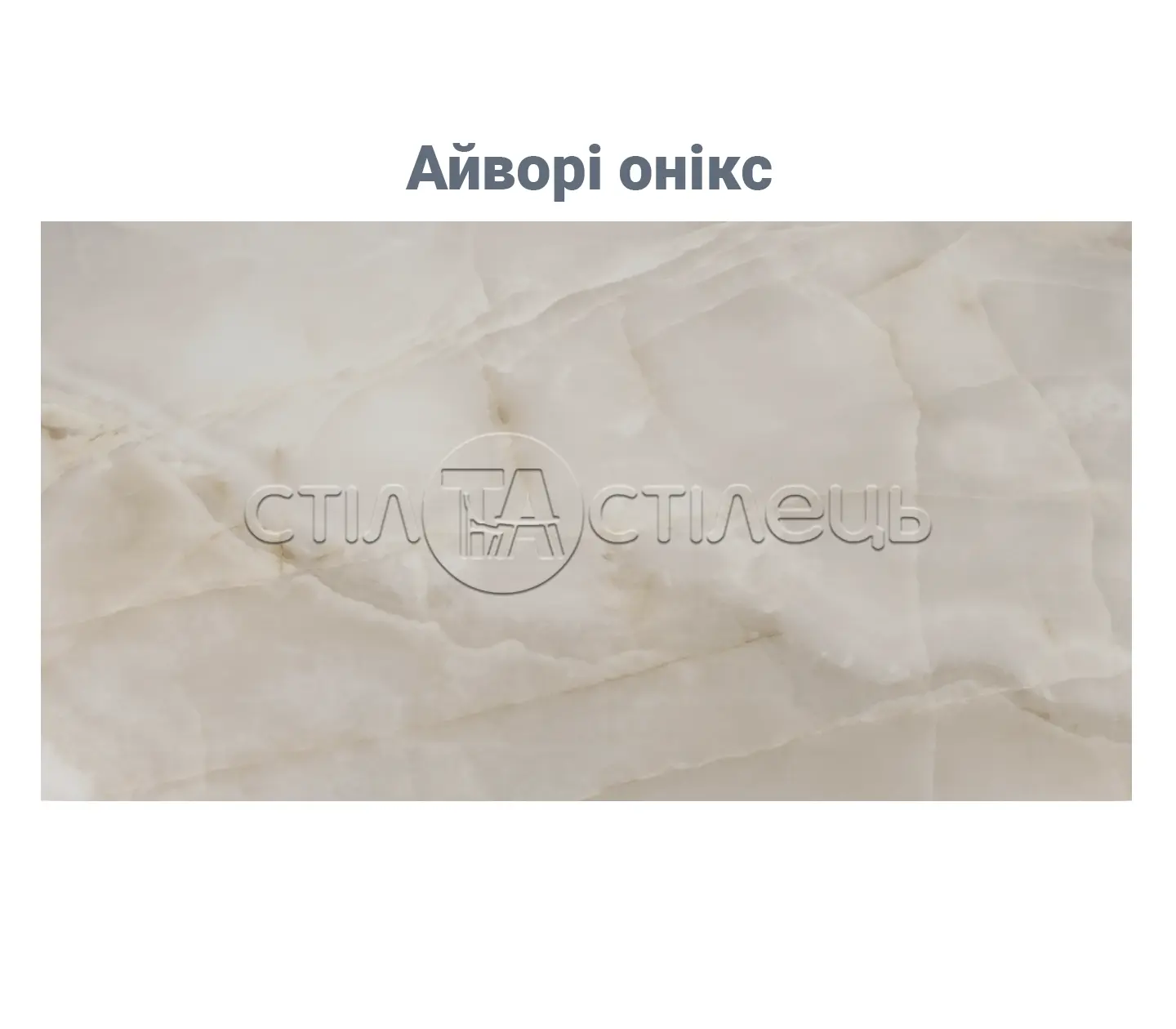- Керамічний стіл Лунаріо — стильний стіл із стільницєю, яка поєдную глянцеву кераміку і гартоване скло у відтінку айворі онікс, що вражає природною красою та глибиною візерунків, нагадуючи сяйво коштовного каменю. Цей стіл додає інтер’єру розкішного вигляду, а фарбована металева основа додає контрасту, підкреслюючи сучасний стиль. Це поєднання створює враження шику та елегантності.