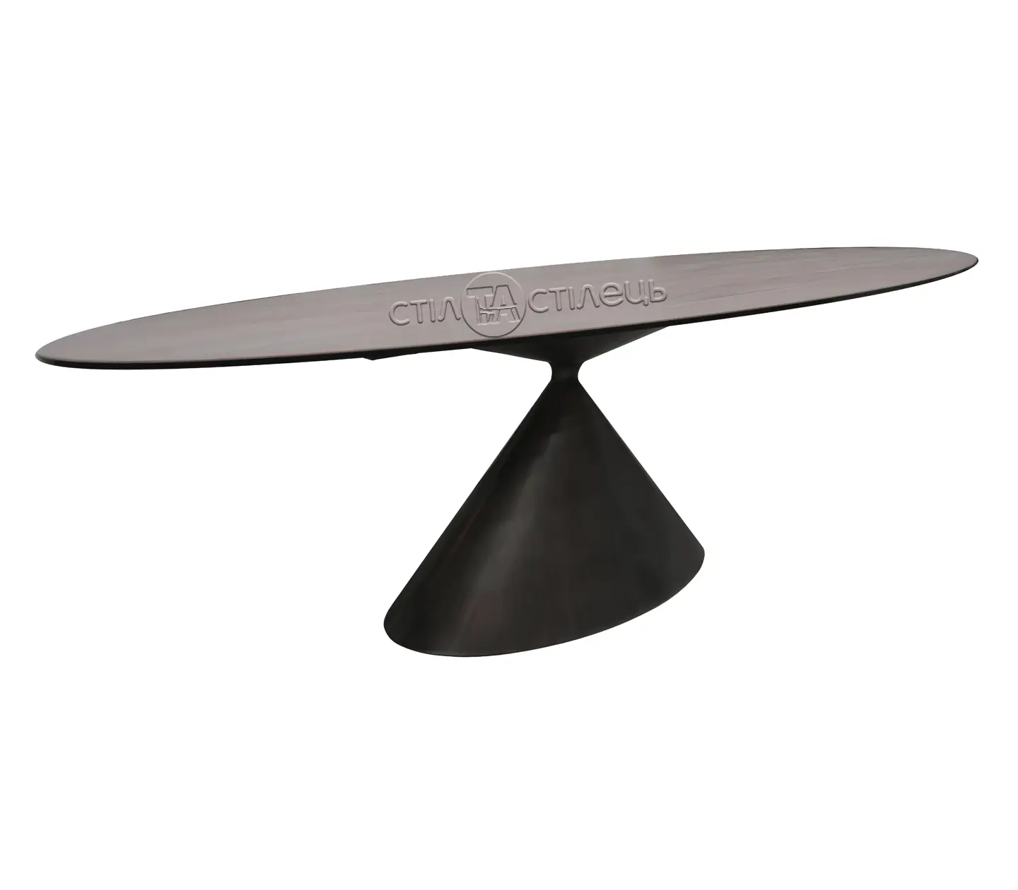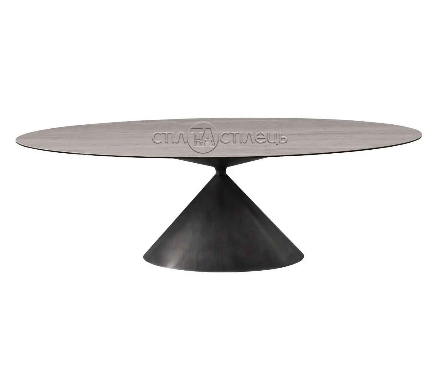 - Овальна стільниця, виготовлена з матової кераміки та гартованого скла, має чудову текстуру, що нагадує природний травертин, додаючи столу натурального шарму. Водночас матеріали відзначаються високою міцністю, стійкістю до подряпин, вологи та температурних коливань.